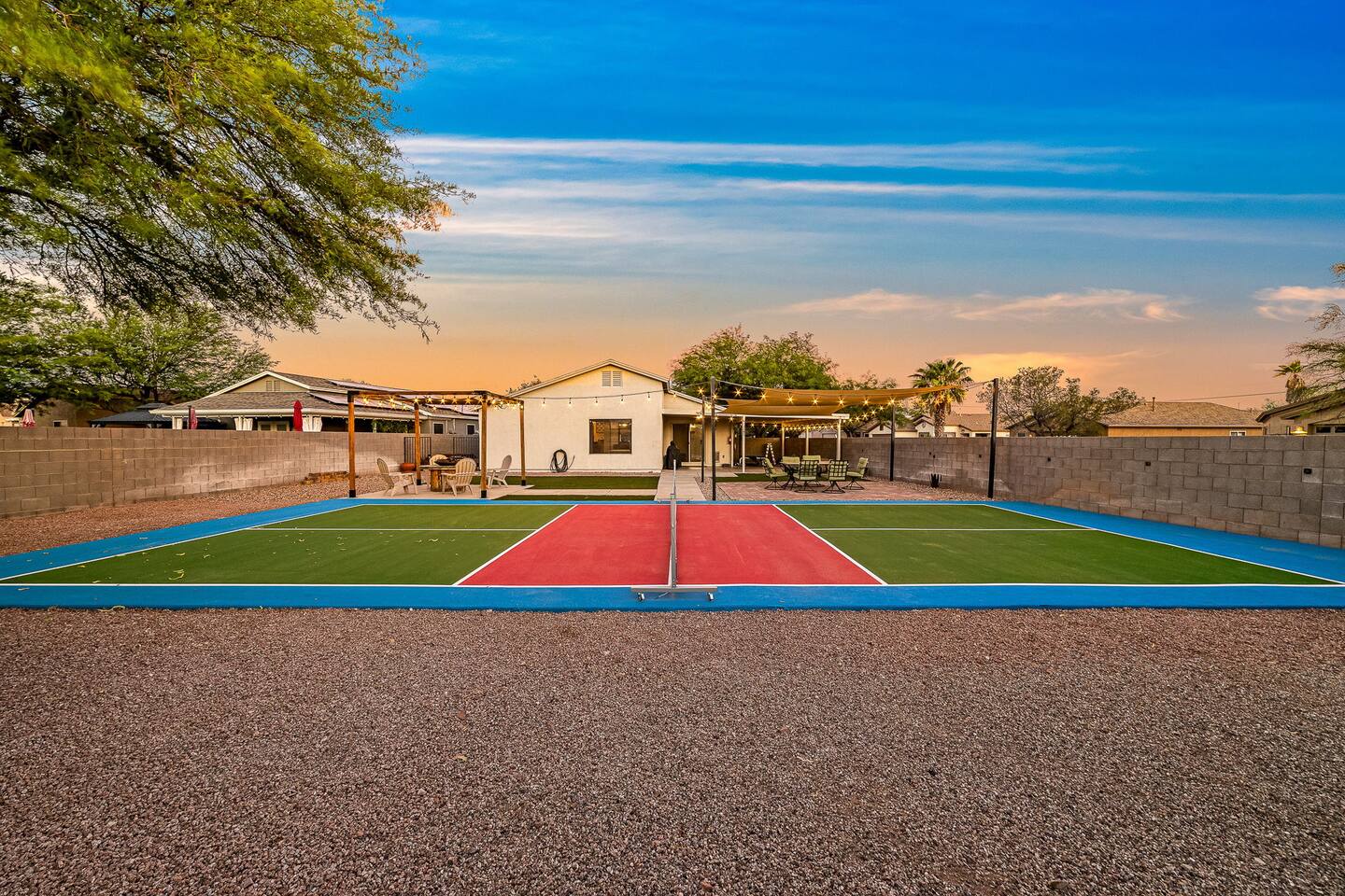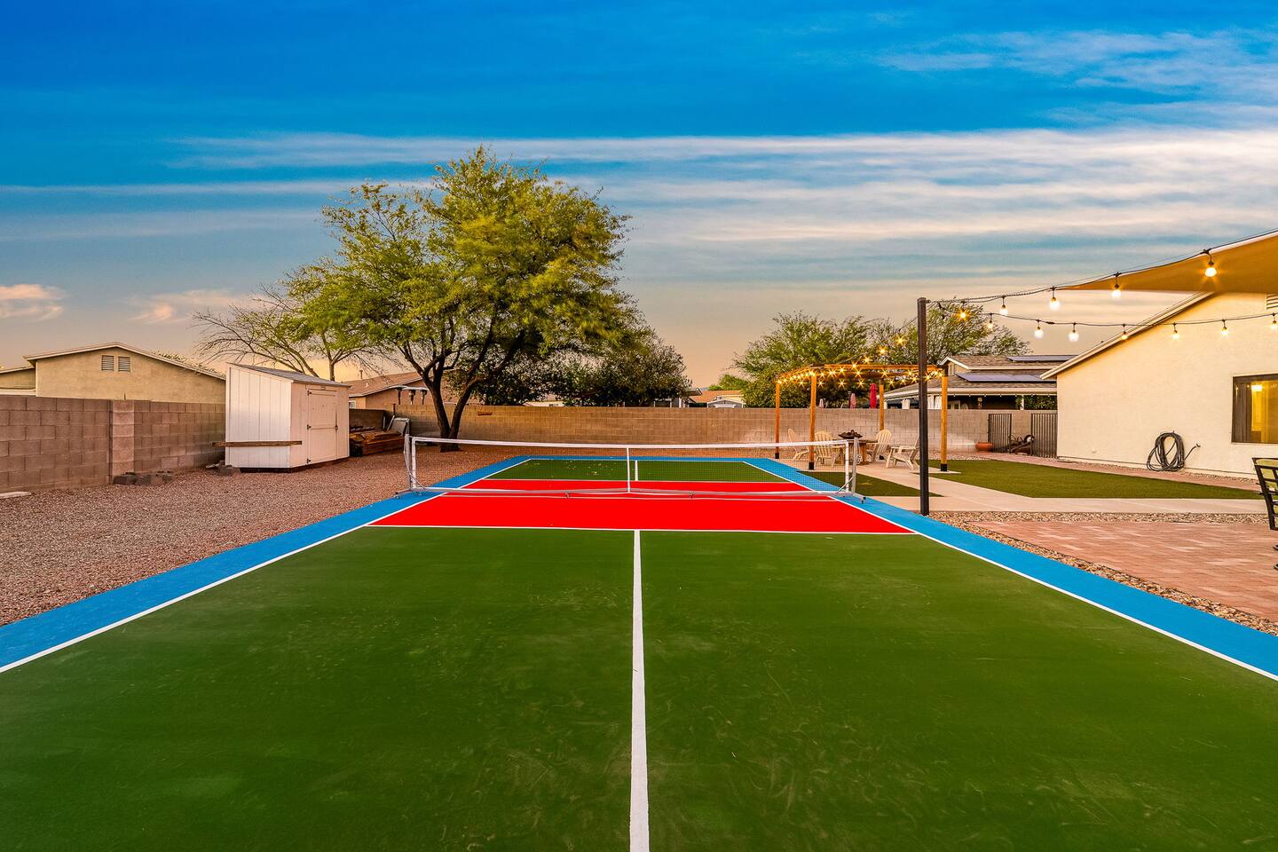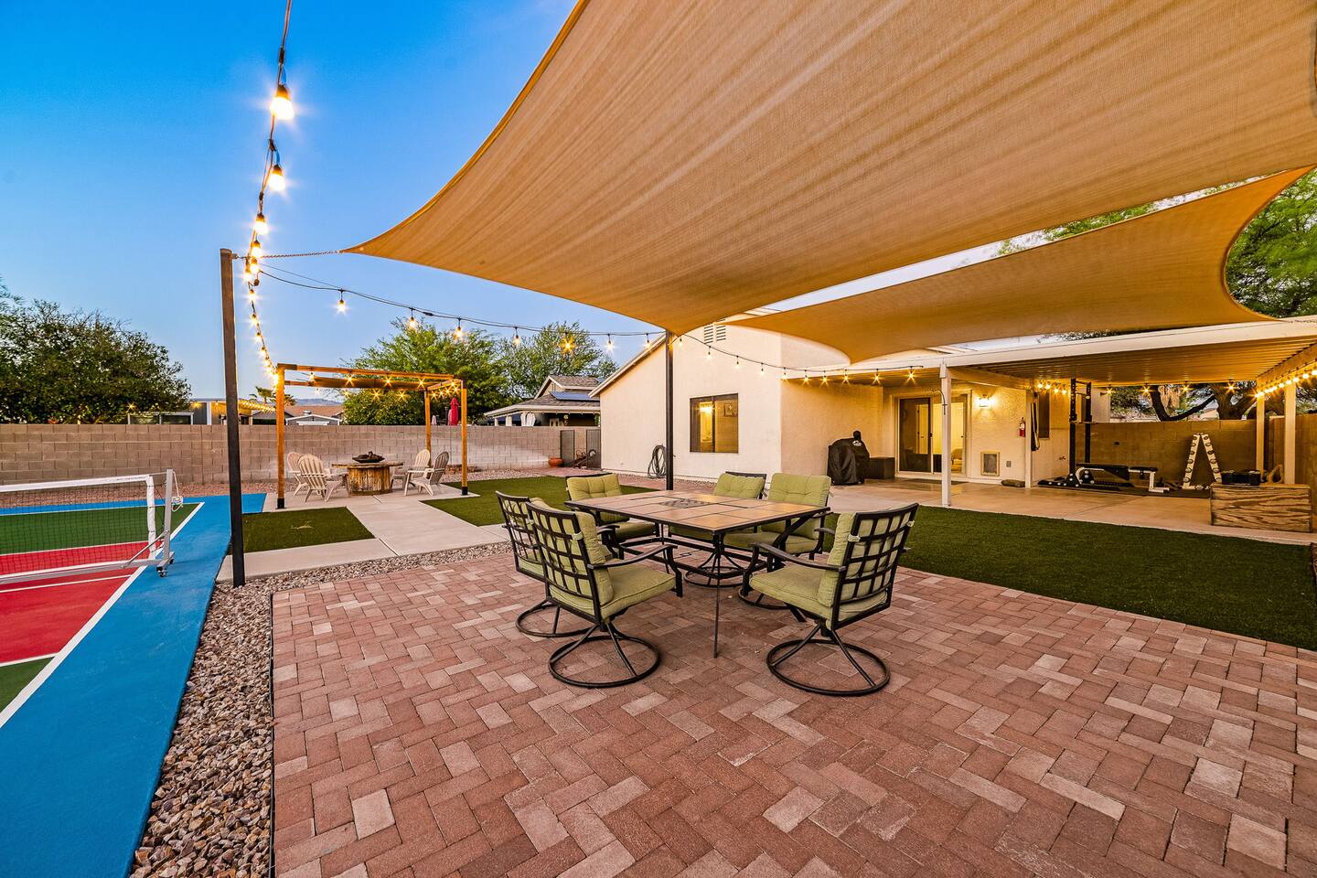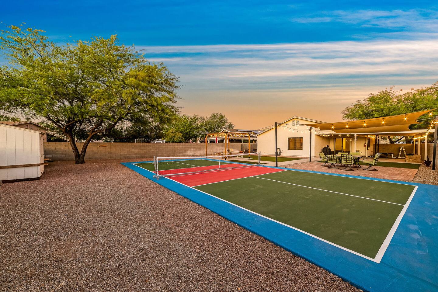 Uncover Tucson's hidden gem – a spacious retreat ideally situated for dining, trail exploration, and easy access to Saguaro National Park. Nestled in a tranquil neighborhood, this home offers a generous yard, a well-equipped gym, and modern conveniences like high-speed WiFi, perfect for work in the dedicated office space. Plus, it's just moments away from the Tucson bike trail. Book now to experience the perfect blend of comfort and adventure in Tucson! This space is a cozy, open floor plan with vaulted ceilings. There are 4 bedrooms to sleep in. The master bedroom has a king bed, in two guest rooms there are queen beds, and the other has a full bed. The kitchen should have all the basic necessities- pots, pans, a rice maker, blender, olive oil, spices, and filtered water. The backyard has a full gym setup, and an outdoor seating area around the fire pit in addition to our BRAND NEW full-sized Pickleball court in the backyard! Welcome to our cherished home, which we're delighted to share with you during our absence. We kindly ask that you treat it with the same love and care that we do. Please note that certain areas, including the garage, kitchen pantry, and two closets, are off-limits as they are securely locked. Thank you for your understanding, and please make yourselves at home and enjoy your stay! We will be available via txt or phone call any time of day for any questions and needs. Please don't hesitate to reach out! This is a very quiet, family-friendly neighborhood that we love so much. There is an awesome park within walking/biking distance that has baseball fields, a skate park, a playground, and wide open grassy areas. We hope you enjoy this neighborhood as much as we do! The best way to get around is by car. There is also the popular Tucson Bike Loop located about a mile away! This is a NON-smoking property (no cigarettes, e-cigarettes, vaping, etc.) Any signs of smoking or damage will incur additional charges. We have the best neighbors, and to respect their peace we ask you to observe quiet hours between 9:00pm and 8:00am.